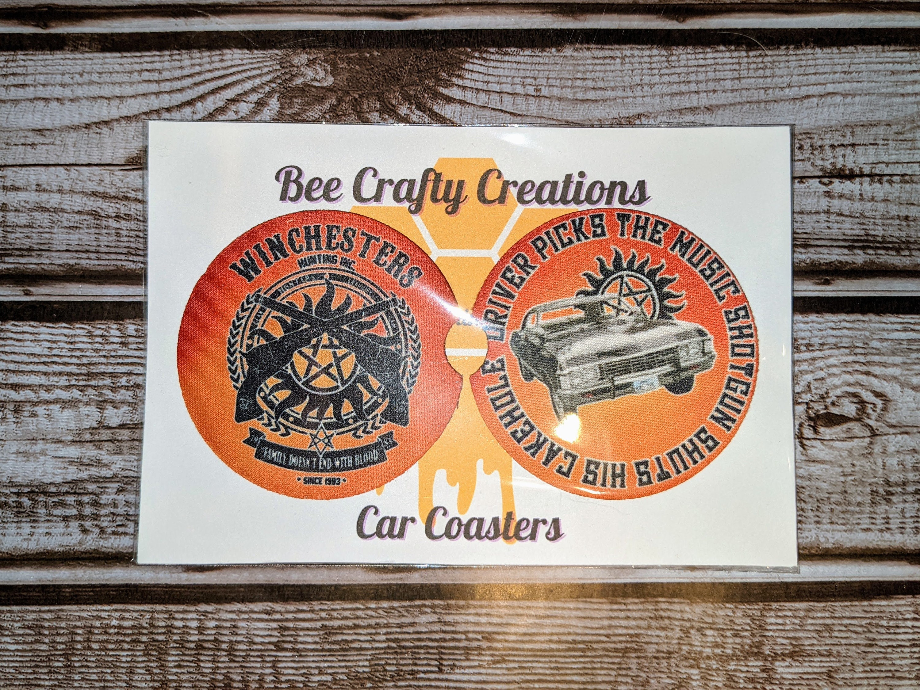 2 Neoprene easy wash supernatural car coasters. These car coasters are super absorbent and can easily be washed making them a convenient addition to any car.
