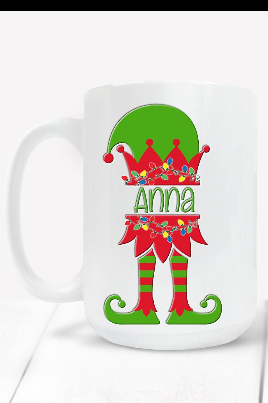 11 oz. ceramic mug with elf design on the front customized with your child's name. The back of the mug has a message from your child's elf signed with your elf's name.
