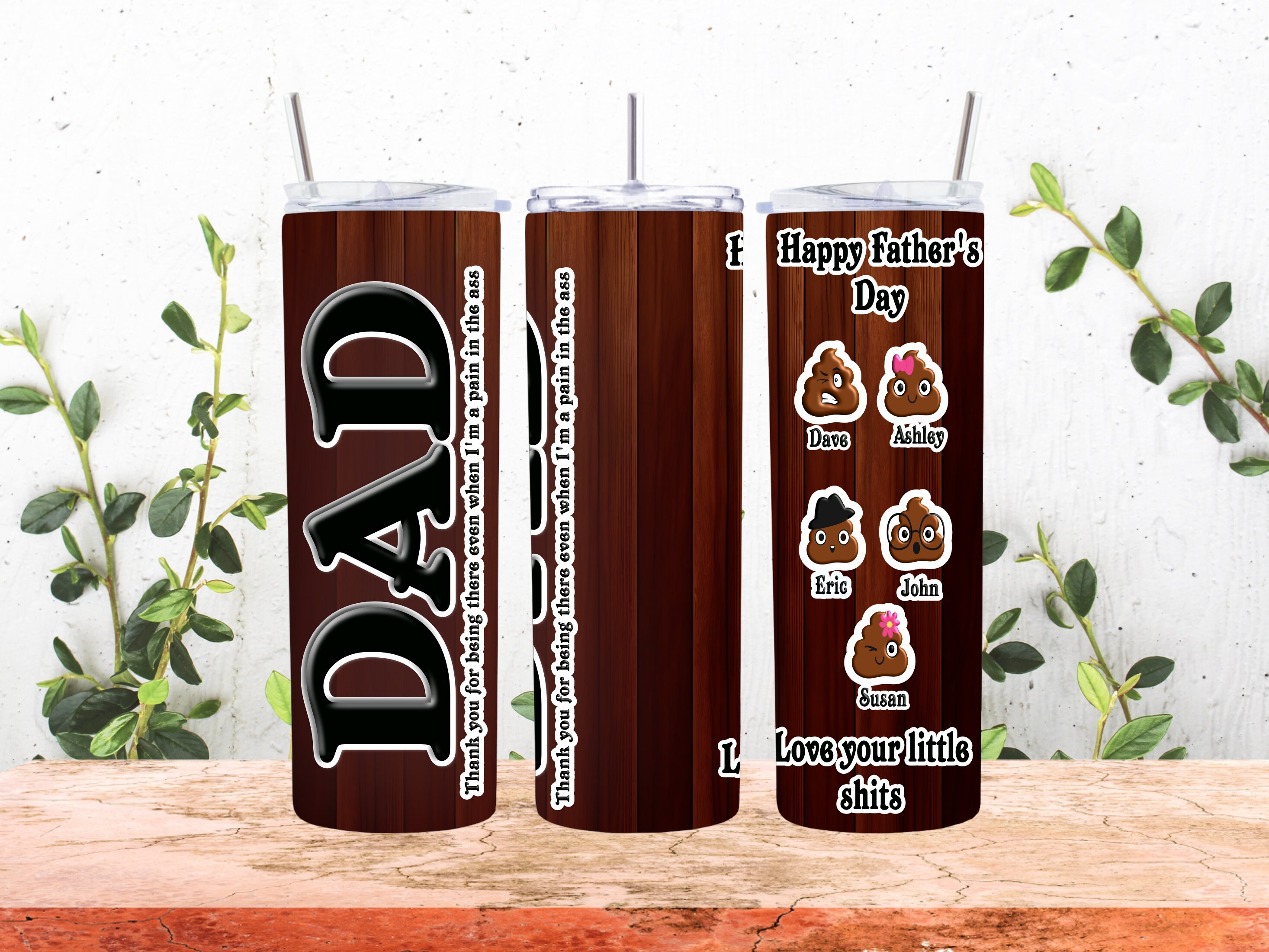 20 or 30 ounce tumbler sizes available for this item perfect for the perfect dad of awesome little shits. Customize with all their names and a special little image for each.